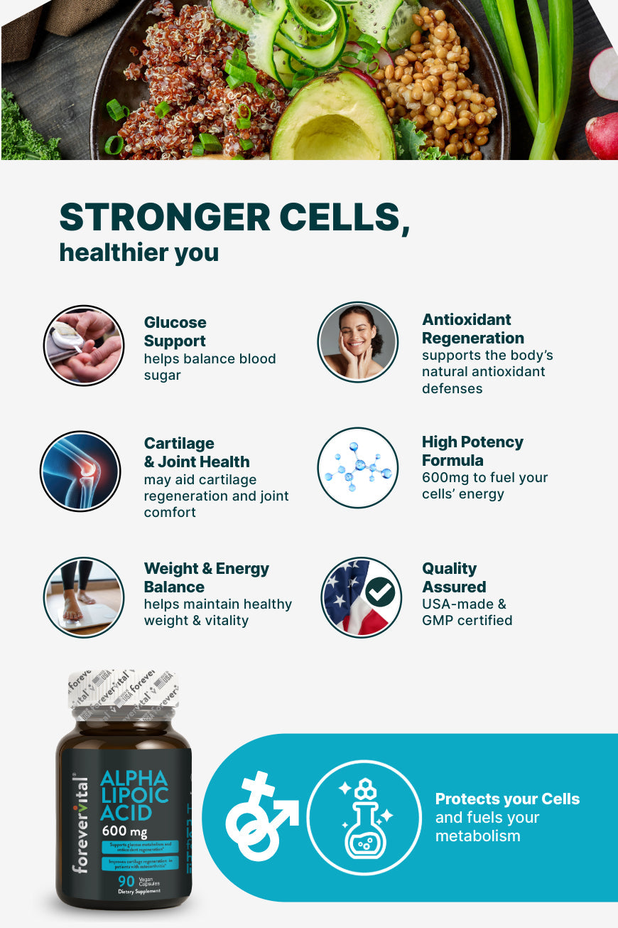 Apoye su vitalidad celular: ¡agregue Forevervital Alpha Lipoic Acid 600mg a su rutina diaria hoy mismo!